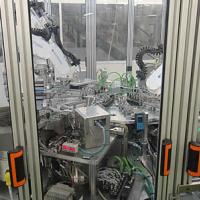 Célula robotizada para alimentação, dobragem e corte de terminais, alimentação e montagem automática de ferrites e terminais no conector, inspeção de boa montagem e qualidade de componentes, teste elétrico, marcação dos conetores a laser, alimentação de conetores e padrões assim como saída dos conetores montados para tabuleiros.